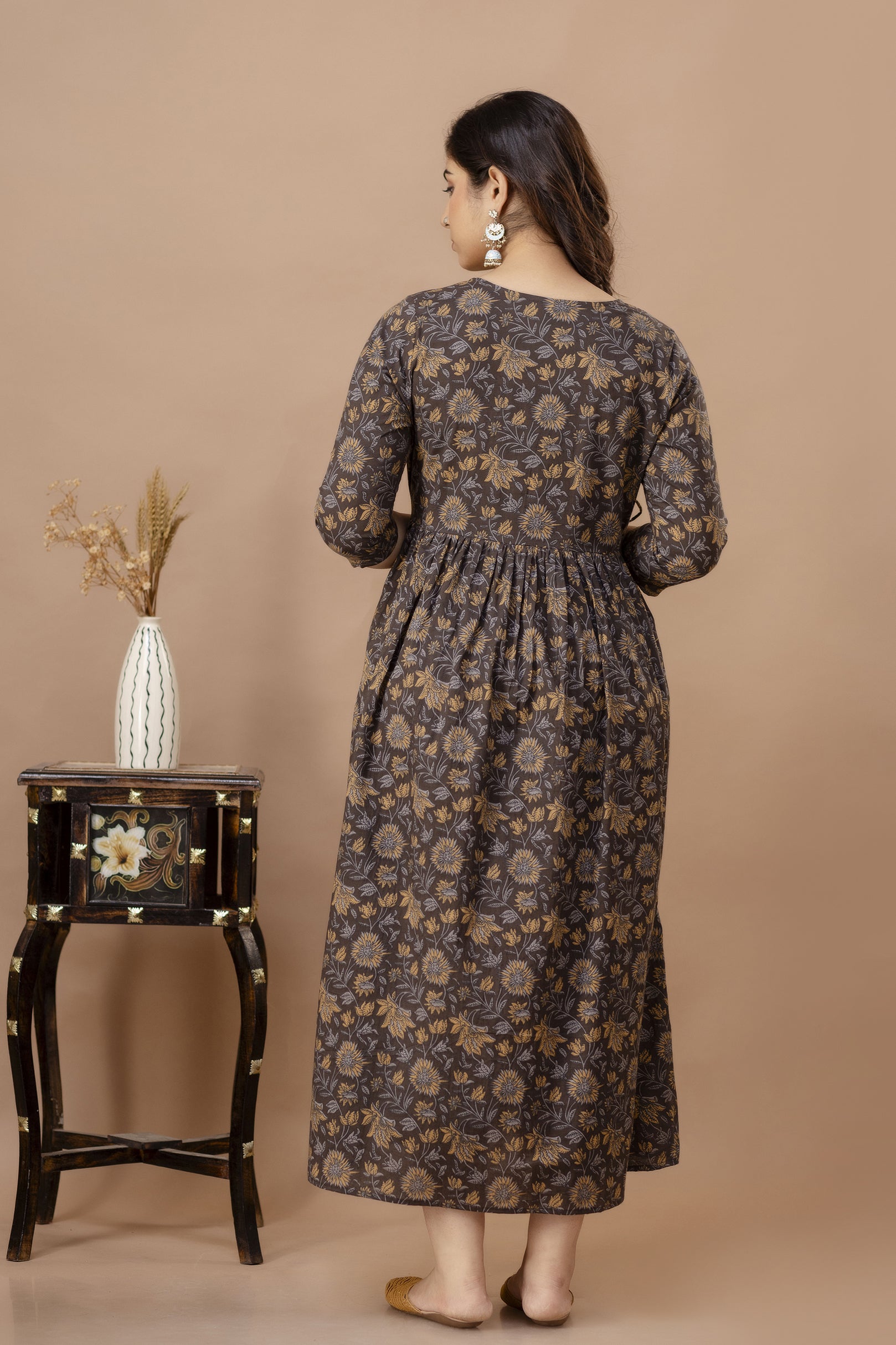 WOMOON Anarkali Brown Maternity Gown | Pure Cotton Feeding | Maternity Kurta For Her